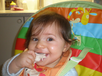Adoras cérelac e sopa. Experimentaste gema de ovo esmagada na sopa e gostaste muito. Fruta comes mas misturada com iogurte e bolachinha. Gostas é de chupar a frutinha na mão, assim como pão que provaste ontem pela 1ª vez e bolachas.